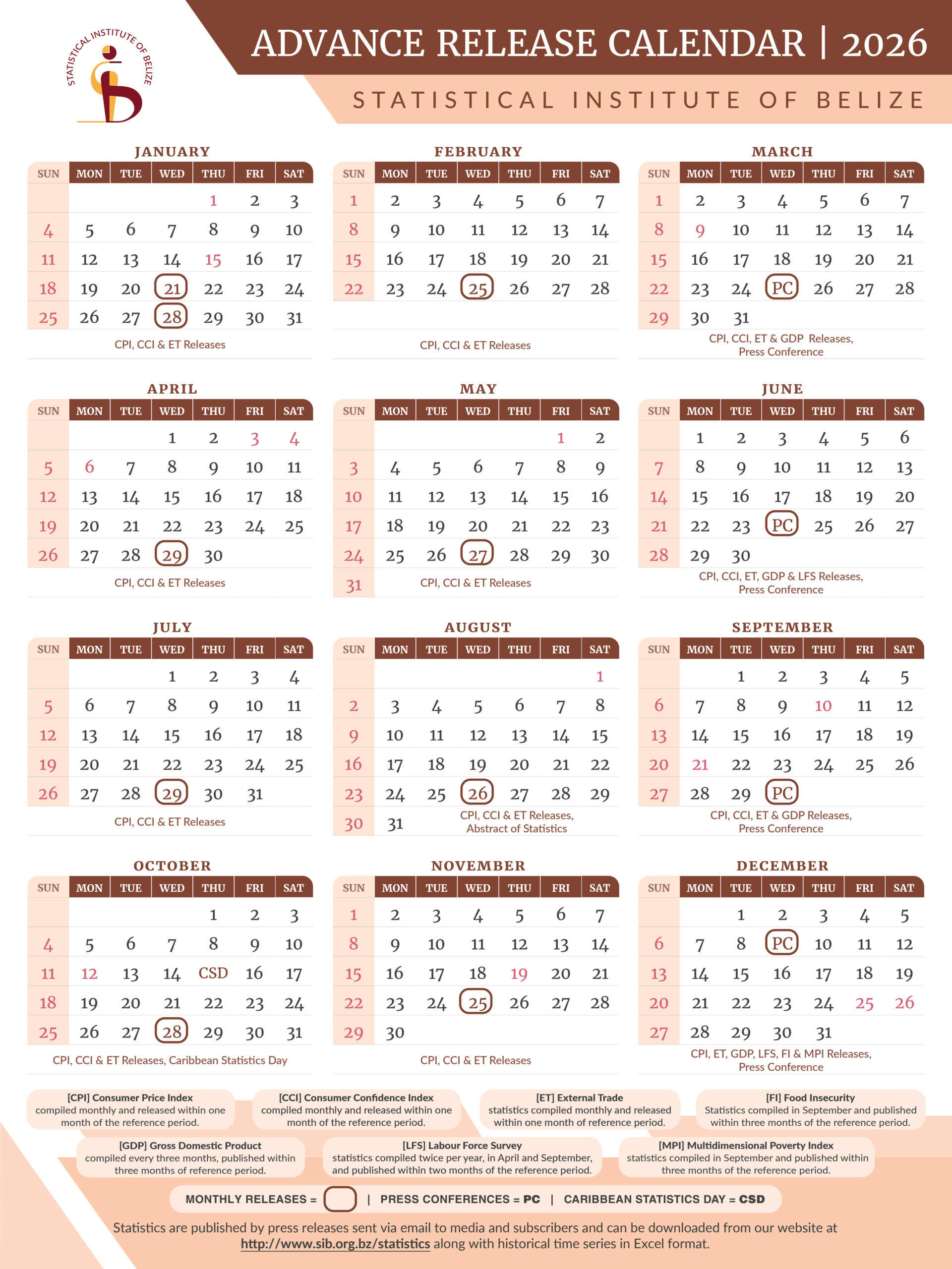 Belize National Statistical System Welcome to BNSS (Belize National Statistical System) App – your ultimate destination for up-to-date statistical indicators on Belize. Designed specifically for those seeking accurate and reliable data, BNSS App is the go-to resource for comprehensive insights into Belize's economic, social, and demographic landscape. Learn More STATISTICAL INSTITUTE OF BELIZE The Statistical Institute of Belize is an autonomous body created to collect, compile, extract, analyze and disseminate official statistics related to demographic, social, environmental, economic and general activities of Belize. LEARN MORE EXTERNAL TRADE Merchandise trade shows the relation of an economy with other economies in the world in terms of goods imported and exported. SIB provides monthly and quarterly merchandise trade bulletins highlighting activities of special interest in these areas. LEARN MORE GROSS DOMESTIC PRODUCT Gross Domestic Product provides a measure of the growth of the economy and the extent of total economic output. This entails the preparation of quarterly and annual GDP and other National Accounts Aggregates. LEARN MORE CONSUMER PRICE INDEX Consumer Price Index measures the change in the prices of a basket of goods and services consumed by households. This index is compiled quarterly for all items in February, May, August and November. For all remaining months, the index is based on the changes in food and fuel categories. LEARN MORE LABOR FORCE SURVEY A labour force survey is conducted twice a year, in April and September. These surveys are conducted for the working age population (persons 14 years or older). Persons of working age who do not have any employment and who do not want employment are not considered to be in the labour force. LEARN MORE